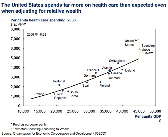 The U.S. in 2006 spent around $650 Billion more on health care than the GDP/capita and health spending/capita relationship would suggest; this year that number is likely around $750 Billion. This is the extra spending beyond what wealth predicts that makes the U.S. the most expensive in the world by far in terms of health care expenditures per capita.